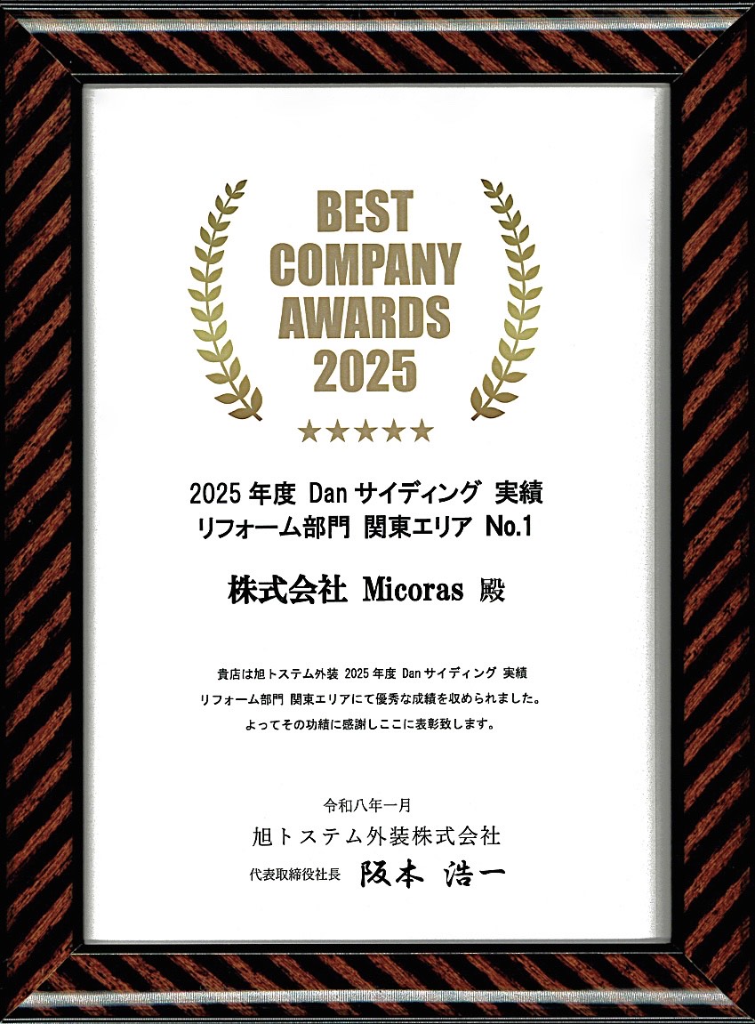 本表彰は、関東エリアにおける金属サイディング工事の施工実績数をもとに評価いただいたものです。